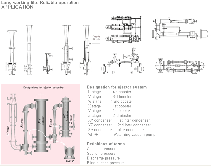 Two stage steam ejectors are used for suction pressure 20kPa (150Torr) or below, and the ultimate suction pressure is up to 2kPa (15Torr).